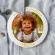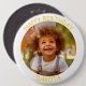 Customizable photo and name birthday button. Yellow font on a small white frame.