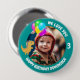Customizable photo, name, age and text - HAPPY BIRTHDAY / WE LOVE YOU - button. Teal frame with white font and a cute dino is holding balloons. Adorable keepsake.