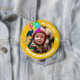 Customizable photo, name, age and text - HAPPY BIRTHDAY / WE LOVE YOU - button. Small yellow frame with white font and a cute dino is holding balloons. Adorable keepsake.
