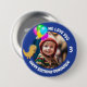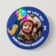 Customizable photo, name, age and text - HAPPY BIRTHDAY / WE LOVE YOU - button. Blue frame with white font and a cute dino is holding balloons. Adorable keepsake.