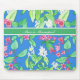 A pretty floral, customizable mousepad, with a pattern of creamy white Mock Orange Blossom and bright pink Weigela on a sky blue background, from a handpainted watercolour design by Judy Adamson.