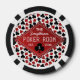 Create your own custom poker room / poker club chip set using this cool, easy template. The background has a pattern of playing card suits (spades, clovers, hearts, diamonds). Over that, there is a black ribbon graphic with a red diamond where you can add all your details in white, including your name, the year your home casino was established and a monogram letter. All text is customizable, including "POKER ROOM" in case you want to change it to POKER CLUB. Using the templates, your text will change on both sides of the chips. To make more detailed changes, "Customize It."