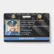 The customizable police department ID badge features a police emblem at the top that can be customized to your department as well as a place for the state logo as well. Customize with the officer's photo on the left. Beside the photo, the officer’s name, badge number, rank, and department are displayed. Add your own barcode to the back of the card, along with issue and expiration dates, and description of the officer, captain, chief, or office employee.