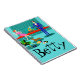 This Customizable Retro Couple with Dog Spiral Notebook looks like a scene out of a romantic comedy. The 1960s's style, minimalist art design features an attractive couple enjoying a romantic evening at home. The sophisticated room prominently features an aqua and teal brick fireplace with a bright red ledge. A beautiful, redhead woman wearing a bright, pink dress is perched on the ledge. She is enjoying a martini with a floating olive, a roaring fire, good music, and the company a tall, dark and handsome man. The man is wearing a blue suit and red tie. His martini glass is raised to toast his charming companion. In his other hand, he is holding a vinyl record album. At his feet, we see a most adorable dachshund wearing a red collar. The playful wiener dog is walking in the direction of a green record player with orange, spindle legs. On the floor, there is a colourful group of fun, eclectic, vinyl records. Cheers! Here's to the perfect evening at home. Personalize this design with the name of the recipient.