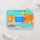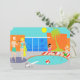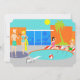 Come on in! The water is fine! This customizable Retro Pool Party Invitation features a vibrant, cartoon drawing of a fun and sophisticated pool party. The mid century modern design centres around a round swimming pool on a large, grey, concrete patio. The pool is filled with turquoise water. Orange brickwork surrounds the pool and there is a white, plank diving board all ready for an adventurous soul. A red and white beach ball is floating in the water. On the opposite side of the pool, two party-goers are dangling their feet in the water, while resting on red and white striped beach towels. The woman with black hair is wearing a pink, one-piece swimsuit. Beside her is a tropical drink in a coconut with a little umbrella and a green straw. The blonde man is wearing bright, green trunks. He is kicked backed with his hands behind his head. To the left of the pool, is a distinguished man with white hair and jade swim trunks holding a drink in a coconut shell. We know he's distinguished because he's a man with white hair! He is talking to a woman with blonde hair and an hourglass figure wearing a turquoise swimsuit. Slung across her arm is a yellow beach towel. Behind this scene is the green silhouette of a palm tree and a futuristic, orange, brick house. Through the large, floor to ceiling, blue glass windows, you can see the silhouette of a television, chair, ottoman, and starburst clock. The sky behind the house is a cloudless turquoise with a round, yellow sun. The opposite side of the invitation is turquoise and has plenty of room for customizing with your party details. These invitations are sure to make a splash!