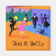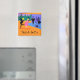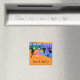This Customizable Retro Urban Rooftop Party Magnet is intoxicating in its detail. The cartoon design features the type of wildly sophisticated cocktail party that is normally only seen in movies from the 1960s. There is a lot for the partygoers to take in. From the comfort of a penthouse apartment, guests are enjoying the view and the ambiance. The lighting sets the mood and we are able to see the darkened silhouettes of an attractive couple dancing the cha-cha. On the floor, there is a purple, portable, record player at the feet of the dancing couple. Several albums have been scattered nearby. Even with the dimmed lighting that makes practically everything in the room appear in shades of purple, blue and black, we can tell that everyone is dressed to the nines. Behind the dancing, indoor couple, there is a gentleman in a black suit holding a martini glass. He is talking to a dark haired beauty who is standing near one of the floor to ceiling glass walls. From a lampstand, a single bulb is casting a romantic glow on the scene. The only thing missing is the lampshade. Hmm... Where is the shade? It's on the head of a tipsy man who has taken the party outside to the orange rooftop. He's clearly got some fine dance moves and he isn't afraid to show them to the world! His companion is a shapely, blonde woman in a bright pink dress. Her back is arched as she throws back her martini in an uninhibited fashion. Beyond the party, there is a breathtaking teal skyline, complete with skyscrapers and a purple sky. If this is how the other half lives, sign me up! Personalize this magnet for a one of a kind gift.