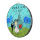 This Customizable Retro Wedding Couple Dart Board will have you hearing wedding bells. The 1960's style, minimalist art design features a bride and groom on their wedding day. The happy couple looks good enough to be standing atop a wedding cake. But they aren't. They're standing on lush, green grass. The debonaire Mr. is wearing a classic, black tuxedo with black bow tie. Down, ladies! He's taken! He is holding the hand of his beautiful Mrs., who looks positively radiant in her tea length, white gown with form fitting waist and flared skirt. She truly looks like a princess with her tiara and gauzy, white wedding veil resting on her pretty blonde head. Beside them, a path in the grass leads to the world's most charming chapel. The quaint, teal and turquoise church is the perfect setting for saying, "I do!" Yes, here is the church. Here is the steeple. We can only assume that, behind those bright red, double doors is a roomful of people just waiting to share in this couple's happiness. The picturesque setting also includes four, stylistic, cartoon trees in shades of blue. It's a beautiful day for a wedding, as we can see from the flawless aqua sky. The only thing missing from this mid century modern design is the rice, and we can assume that will be forthcoming. Personalize with names and date.