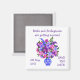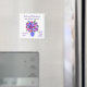 A pretty Save the Date fridge magnet for you to personalize, with a bouquet of pink, blue and purple flowers in vase with a pattern of hearts, from a handpainted paper collage by Judy Adamson
