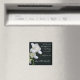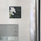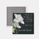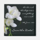 A pretty 'Save the Date' fridge magnet for you to personalise, with a spray of white freesias on a black background, from a photograph by Judy Adamson