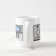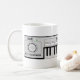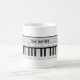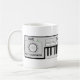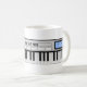 A customizable mug with a synthesizer keyboard design. The synthesizer has a piano keyboard, control buttons and knobs. A blue digital display has a customizable text area.