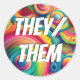 The rainbow color scheme is a nod to the vibrant and diverse LGBTQ+ community and is sure to catch the eye of anyone who sees them. These classic round stickers can be customized with your preferred pronouns - they/them, she/her, or a combination of both - allowing you to add a personal touch to your belongings.