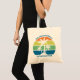 These cool personalized tropical beach sunset tote bags feature 3 palm trees silhouetted against an orange and blue sky accented with yellow and green at the coast. Customize for great family trip keepsake gifts for your coastal getaway this spring break or summer or ocean cruise vacation.