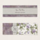 A digital image with a vintage floral wallpaper pattern of lavender purple roses and rosebuds and soft teal green vines and leaves on a creamy background on top, and a lavender purple and grey marble image on the bottom, with a ribbon overlay and a customizable monogram text seal.