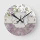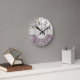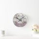 A digital image with a vintage floral wallpaper pattern of lavender purple roses and rosebuds and soft teal green vines and leaves on a creamy background on top, and a lavender purple and grey marble image on the bottom, with a ribbon overlay and a customizable monogram text seal.