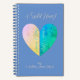 The design is of yellowish, orange and bluish, green his and hers half hearts presented in an elegant, minimalist design on a cornflower blue background, along with four (4) customizable typography fields title, names, monograms, or other personalization.