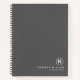 The contemporary notebook boasts a simple design, adorned in the timeless black and white colour scheme. Your unique name graces the lower right corner in an elegant yet understated font, accompanied by a tasteful monogram emblem. The front cover showcases a personalized touch, featuring your name and the initial of your monogram in sleek, modern typography. Crafted with individualized text, this business notebook epitomizes minimalistic charm.