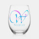 The artwork features the alphabet letter "W" in an artful script font of a colourful abstract design - extracted from a photo of spring plants captured using a special camera technique, along with customizable typography for name or other personalization in blue font. Personalize this monogrammed stemless wine glass by adding the name or words of your choice to best suit your purpose or event!