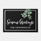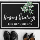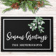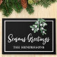 It is decorated with watercolor mistletoe on a black background and says Seasons Greetings in stylish typography.