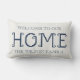 Extend a warm and personalized welcome to your guests with this stylish and cozy lumbar throw pillow. The design features the phrase "WELCOME TO OUR HOME" in an elegant, simple blue font, complemented by the main text "HOME" which utilizes a unique, charming pixelated or cross-stitch style typeface. Below, there is space to add your family's name, as indicated by "THE WILSON FAMILY" placeholder, making it a perfect customized piece of home decor. This pillow is an excellent accent piece for a sofa, armchair, or bed, blending classic hospitality with a modern, slightly rustic design aesthetic. The crisp blue and white color scheme fits effortlessly into various interior design styles, from coastal to farmhouse chic. Create a welcoming atmosphere in your entryway or living room and customize yours today!