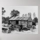 Old photo of cut-over land farmer in front of log cabin surrounded by antique car, tools, furniture and junk. Near Black River Falls, Wisconsin. Photo taken in 1937 by photographer Russell Lee.