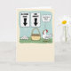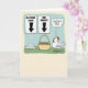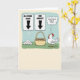This cute and funny cartoon birthday card features a chicken who sees all its eggs next to a basket and is tempted to put all of those eggs into that one basket. The chicken wisely thinks it might be a trap.