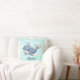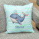 This personalized kids' throw pillow features a cute whimsical whale in a vibrant pink and blue colour scheme swimming playfully with a tiny hat.