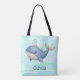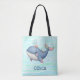 This personalized tote bag features a cute whimsical whale in a vibrant pink and blue colour scheme swimming playfully with a tiny hat.