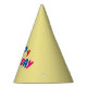 A variety of coloured letters form the words Happy Birthday on a bright yellow party hat.