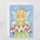 Vintage illustration Christmas religious holiday image featuring a beautiful, happy angel with a halo, a star necklace and wings holding a scarf with the word "joy."