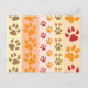 A cute design with several rows of animal paw prints in natural colours like brown, yellow, red and orange on a striped pattern. Some paws have claws and others do not.
