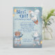 This cute and charming baby shower invitation features an illustrated outer space theme. Two animal astronauts are pictured floating near the bottom. a fuzzy brown bear is featured on the left, and a cute little bunny astronaut is featured on the right. A little rocket ship is pictured near the top right, shooting past a smiling, happy full moon. It's perfect for a celebrating a new baby boy.