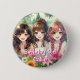 Cute anime themed birthday girl button. Three cute anime girl about pre-teen or teenage age, with pink and yellow flowers around them.