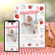 This cute any year birthday invitation features a photo template with a pink and berry red overlay that says "berry sweet." The border has matching pink and red strawberries and black outlines. The back is a watercolor red gingham farm plaid.
