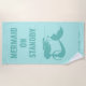 Cute aqua blue mermaid beach towel with custom name. Personalized beachtowel with little mermaid silhouette design and elegant brush script typography. Add your own funny quote, real name or monogram letters. Unique Birthday party gift idea for girls, daughter, wife, mom, grandma, friend, cousin, sister, bride etc. Fun outdoor accessories for beach, travel or pool. Fun underwater fairytale illustration with wavy hair, fish tail and customizable background color. Presents for her. Mermaid on standby.