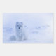 Sticker with a photograph of a white arctic fox. A wintery snowy landscape surrounds this delightful creature.
