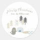 These cute sticker labels feature a North Pole theme. Illustrations of cute arctic animals are pictured around an igloo in the chilling winter cold. A polar bear is pictured at the top, surrounded by pine trees. A walrus is sitting in front of the igloo, and a baby seal is perched at the edge of the sea. A Merry Christmas greeting is printed across the top, followed by a sample family name. You can personalize the stickers to include your own custom name or text.