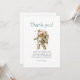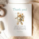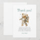 This cute baby shower thank you card features a watercolor teddy bear dressed as an astronaut below the words "Thank you" in blue-green hand printing. Personalize the text with your message in charcoal gray sans serif font and blue-green hand-printed signature line.