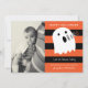 A white ghost saying "BOOO" over orange and black striped background. Your photo on the left. Add your own text or photos to back for a Halloween party invitation or October baby shower thank you card. Please contact me with any questions or special requests. Thanks for stopping by!