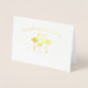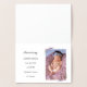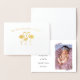 Cute, real foil front of a family of three flamingos, one smaller, with "Our flock has grown by three" curved over the top. Inside is the baby's photo template, name, birthdate, time of birth, weight and height, all in templates to personalize. Photo has tiny, lavender floral, watercolor, swash, photo holder, corners that barely overlays top left and bottom right edges of photo.