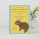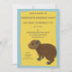 Throw the perfect capybara birthday party with these fun custom invites that feature an illustration of a cute baby capybara or a capybara pup in brown against a yellow and light blue background. The reverse side has a coordinating colourful striped design.