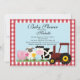 Start your barnyard baby boy baby shower, baby girl baby shower or neutral baby shower off right with our cute little farm animals baby shower invitation. Our stylish & modern Invitation features an adorable farm animal scene featuring a tree, a red barn, a farm traitor with a roaster pig, sheep, & cow set on a rolling hills background with a white picket fence set on a sky blue background . The back of is a trendy brown coordinating colour. Visit our shop for a large selection of baby shower invitation for boys, girls or a gender neutral baby shower. ©Babystar Designs