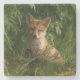 A stone coaster with a photograph featuring a cute little baby fox with red and white fur. Surrounded by lush green leaves and grasses.