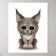 This cute design features a small lynx cub with large pointed ears and deep black eyes. The kitten is sitting down with its paws beside each other and is looking forward which creates a symmetrical pattern. The over sized head and small body along with the details in the fur create a beautiful combination of a cartoon and realistic look. This unique design is an adorable example of this wonderful and majestic big cat.