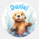 A sticker with an adorable funny animal, a baby sea otter playing in splashes of water on a white background. The illustration's blue and brown bright colours evoke joy and playfulness. This unisex sticker, ideal for both boys and girls, is perfect for envelope seals or gifts, as well as personal belongings. Change or remove the name to customize.
