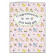Cute pattern with baby items on the pink background: teddy, rubber ducky, pacifier, baby bottle, stroller... For baby girl.