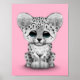 This cute design features a small snow leopard cub with large ears and deep black eyes. The kitten is sitting down with its paws beside each other and is looking forward which creates a symmetrical pattern. The over sized head and small body along with the details in the fur create a beautiful combination of a cartoon and realistic look. This unique design is an adorable example of this wonderful and majestic big cat.