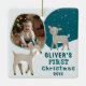 Cute Baby's 1st Christmas Photo Reindeer Ceramic Ornament. Celebrate a precious milestone with this adorable personalized baby's first Christmas ornament. Featuring a charming woodland deer design and festive 'First Christmas' text, it's the perfect way to commemorate your little one's first holiday season. Easily customize with your baby's photo and name, creating a truly unique keepsake. This ornament makes a cherished gift for new parents or a beautiful addition to your family's Christmas tree.