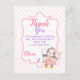 This thank you postcard is a perfect way to say thank you to your party guests. It can be used for kids birthdays or baby shower occasions. Features a pale pink decorative frame with a cartoon baby Penguin dressed as a ballerina in a pink tutu twirling a pink ribbon. The background has a pale pink stripey pattern. Can be customized by amending the text then personalize with a name. Matching party items available from suziigifts.