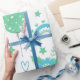 Celebrate special moments with this charming wrapping paper featuring a playful pattern of green balloons with stars, rainbows, hearts, birds, and flowers in soft green and blue tones. Perfect for baby showers, birthdays, and personalized gift wrapping. Add a cheerful and whimsical touch to your packaging for any occasion. Ideal for gender-neutral parties, kids’ celebrations, and boutique gift wrap.
