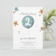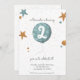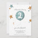 Adorable and simple two year old birthday invitation with a fun illustration of a blue balloon and stars. Illustrated and designed by Patricia Alvarez.